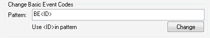 This option gives you possibility to recodify all the basic events in your database, using template. The template may contain any symbols and also an <ID> placeholder which will be replaced by event's unique number by order in event's list. For example, with the default template shown above, all the events in your database will get codes like BE1, BE2 etc. Set up the template and press the Change button.