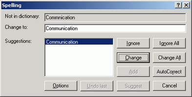 | 3. | The standard Spelling dialog box is displayed with options for replacing the misspelled word. |